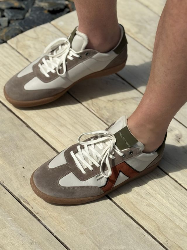 Ces baskets pour homme aux empiècements kaki terracotta gris, en font une pièce audacieuse et moderne.