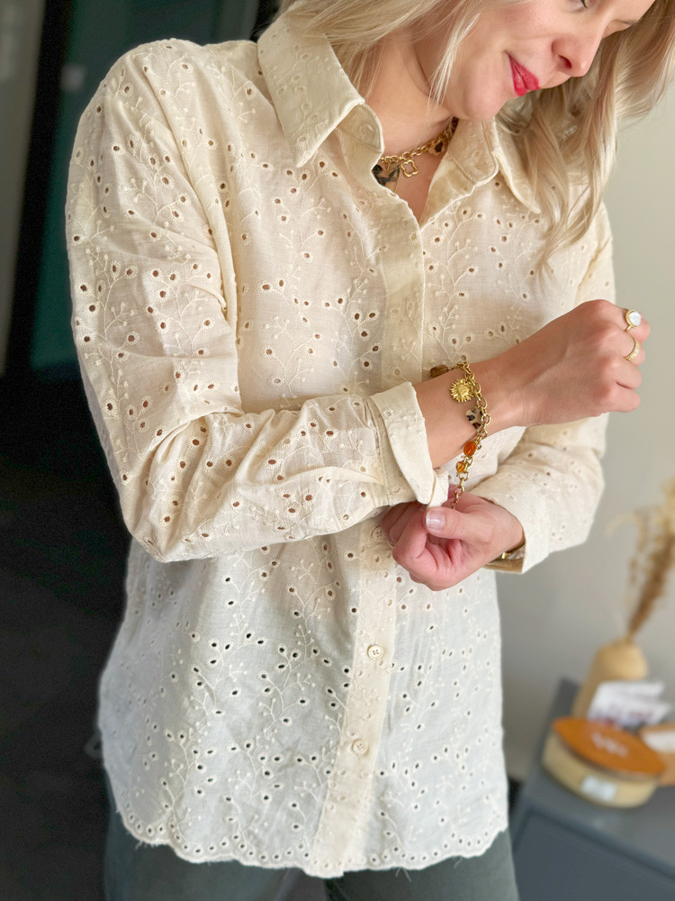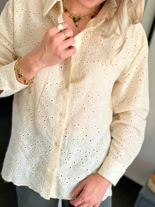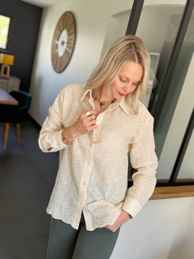 Apportez une touche raffinée à votre garde-robe avec ce chemisier écru délicatement brodé, sublimé par des détails ajourés inspirés de la broderie anglaise.