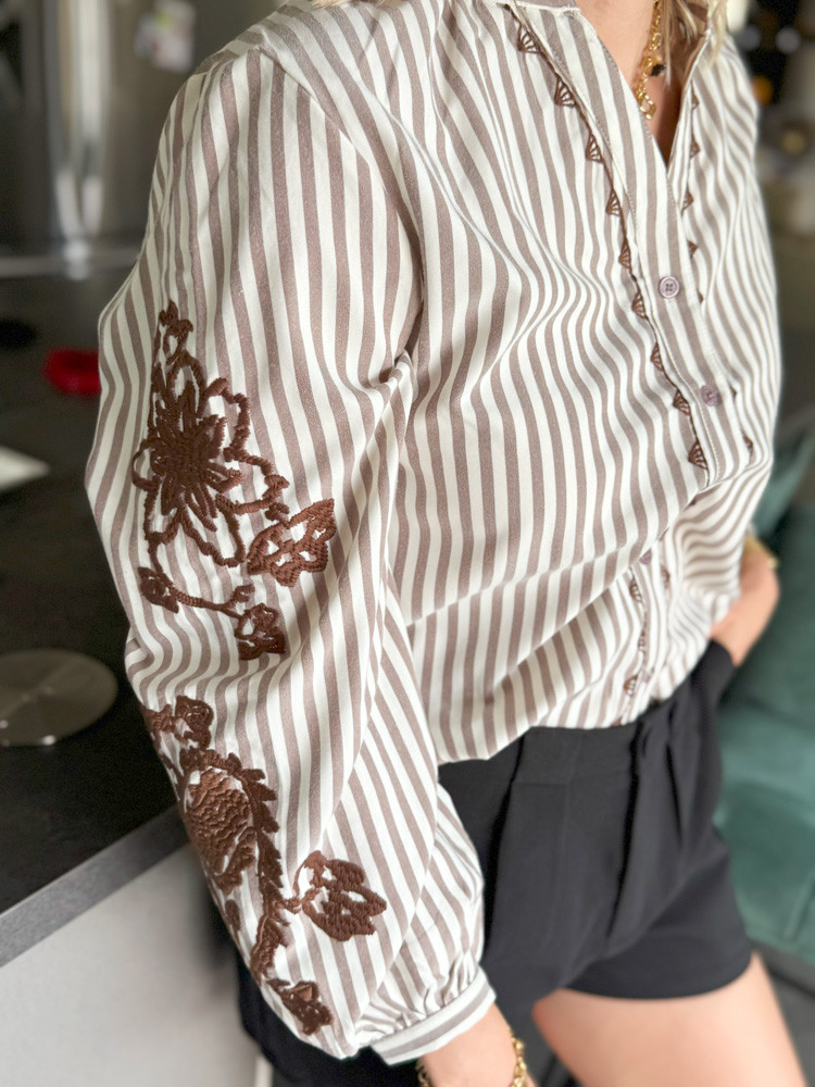 Alliant élégance et originalité, cette blouse rayée couleur café se distingue par ses broderies marron délicates sur les manches, apportant une touche raffinée et féminine.