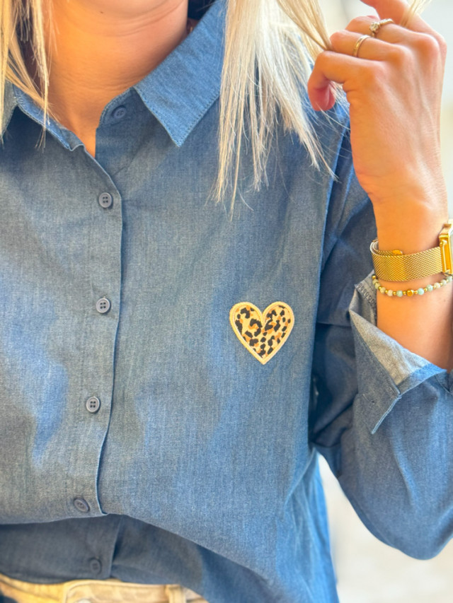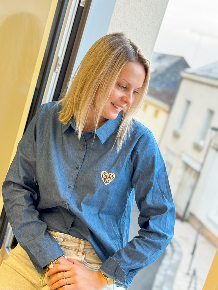 Ajoutez une touche de caractère à votre dressing avec ce chemisier bleu denim pour femme, rehaussé d’un motif cœur léopard brodé sur la poitrine. Un modèle à la fois intemporel et audacieux.