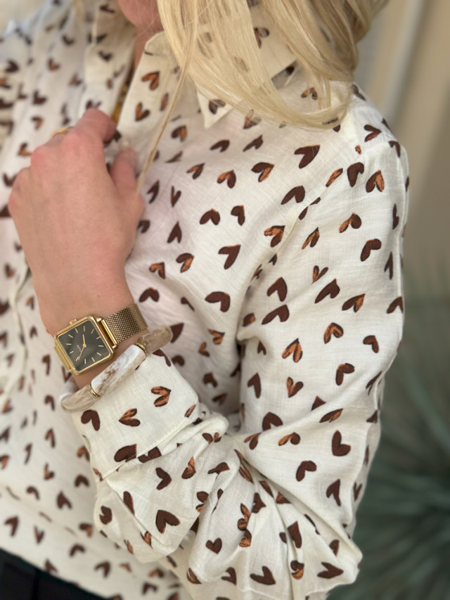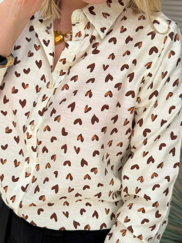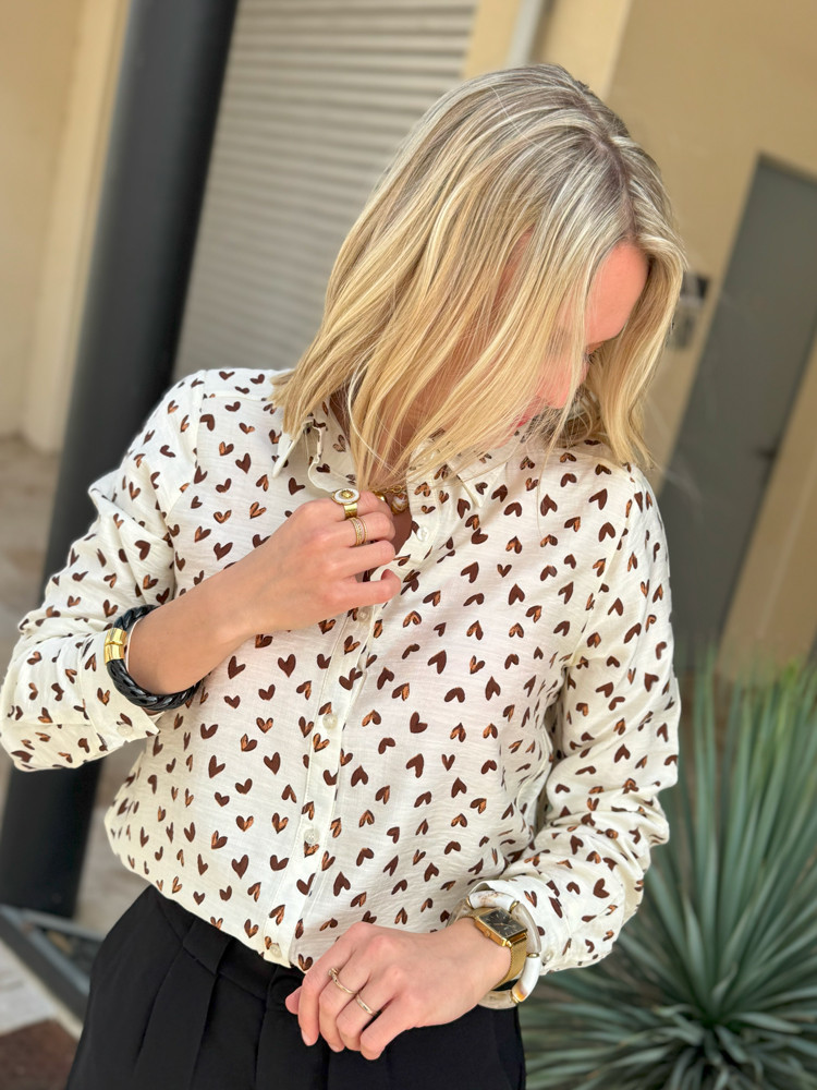 Craquez pour le charme romantique de ce chemisier orné de cœurs marrons.