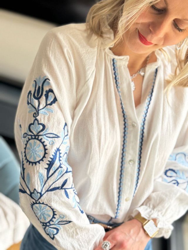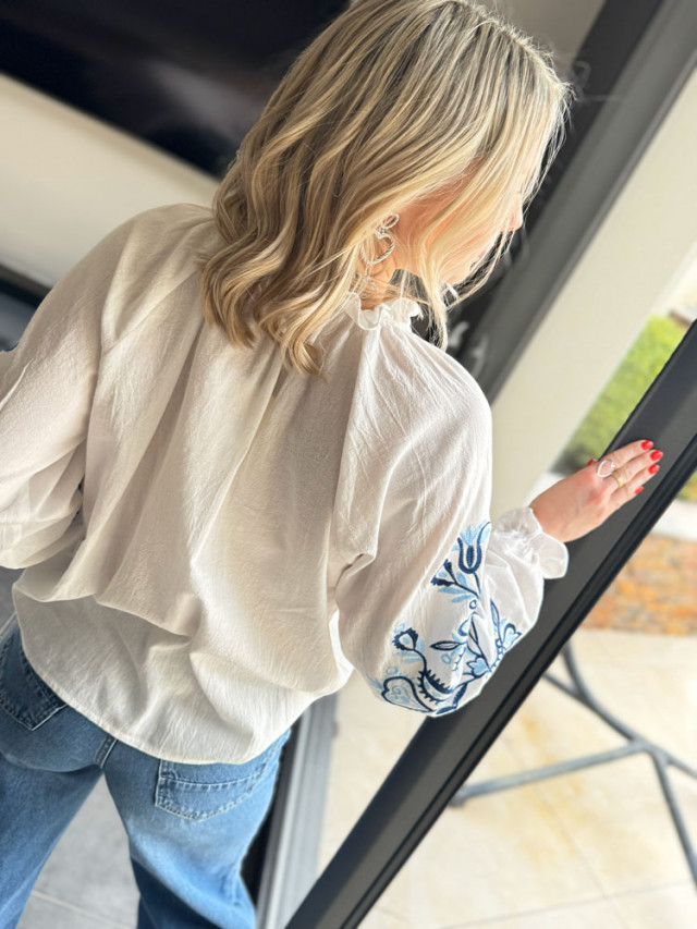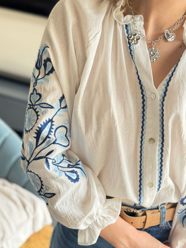 L’éclat du blanc rencontre la profondeur du bleu. Cette blouse blanche vaporeuse est sublimée par de délicates broderies bleues. Une pièce lumineuse et intemporelle, parfaite pour apporter une touche de fraîcheur