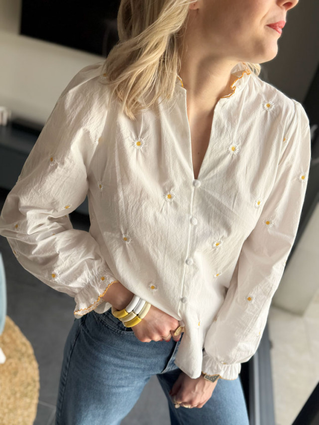 Insufflez un vent de fraîcheur à votre garde-robe avec notre chemisier orné de pâquerettes. Entre esprit vintage et modernité, cet imprimé floral iconique apporte une touche de douceur et de printemps à votre garde-robe.