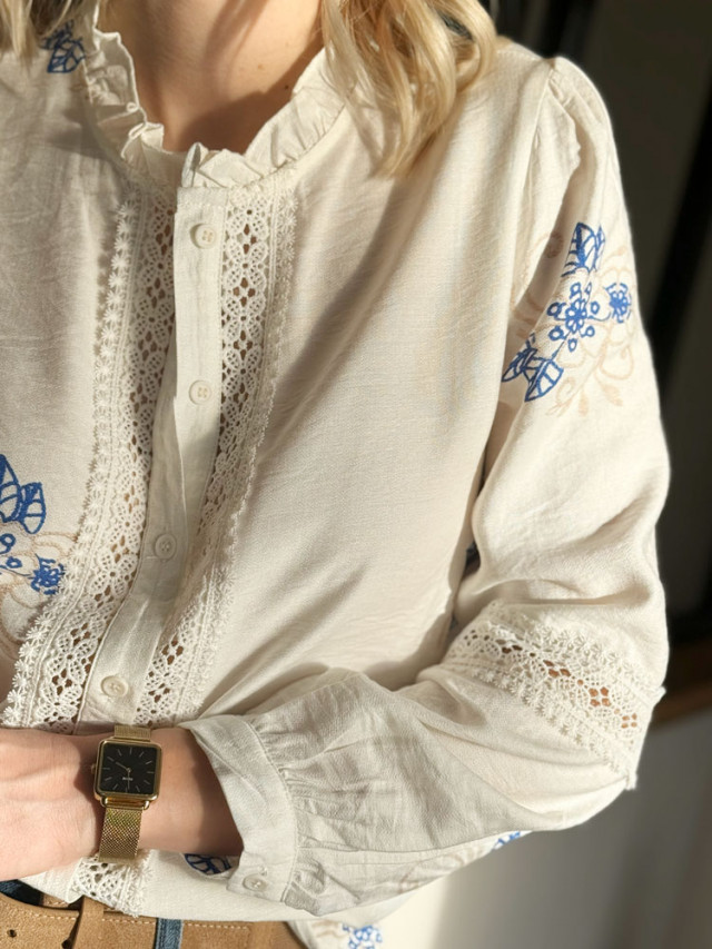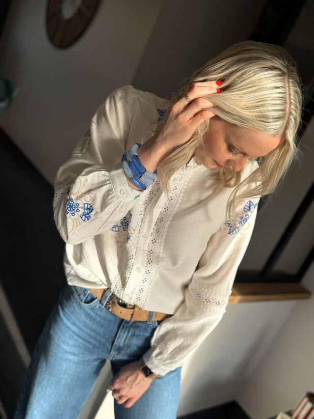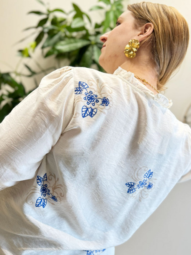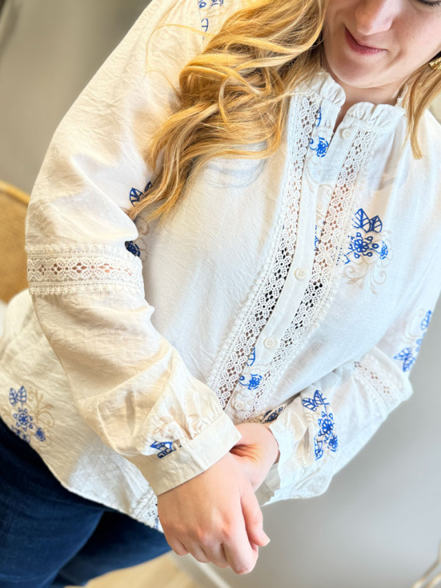 L’essence même du style bohème-chic. Cette blouse blanche vaporeuse réunit l’élégance de la dentelle ajourée et le charme d'un imprimé bleue. Pièce lumineuse elle apporte une allure chic et romantique.