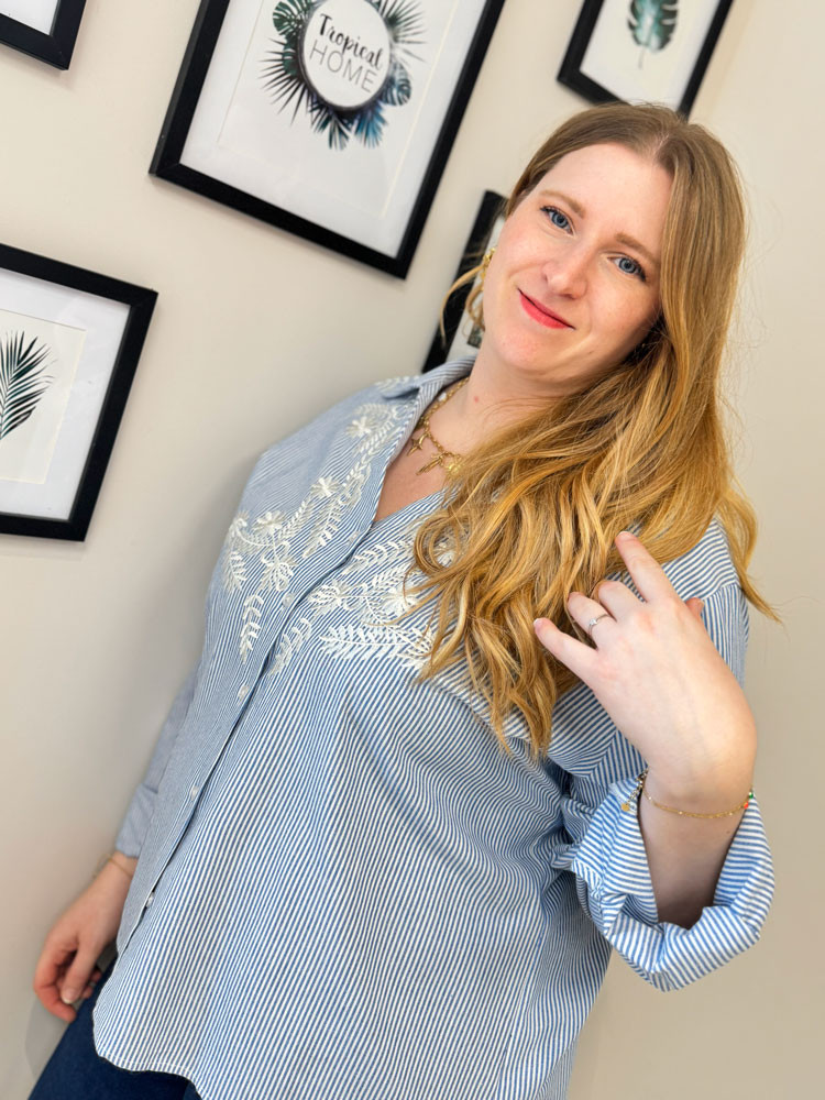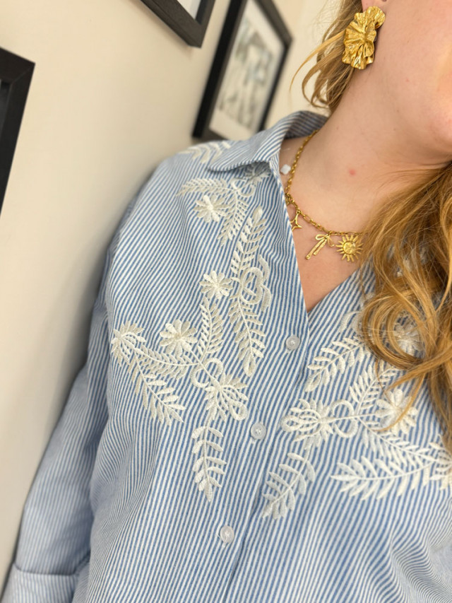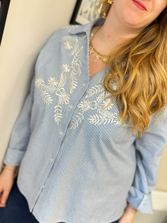 L'indispensable rayé se réinvente. Ce chemisier bleu à fines rayures blanches est sublimé par de délicates broderies florales.