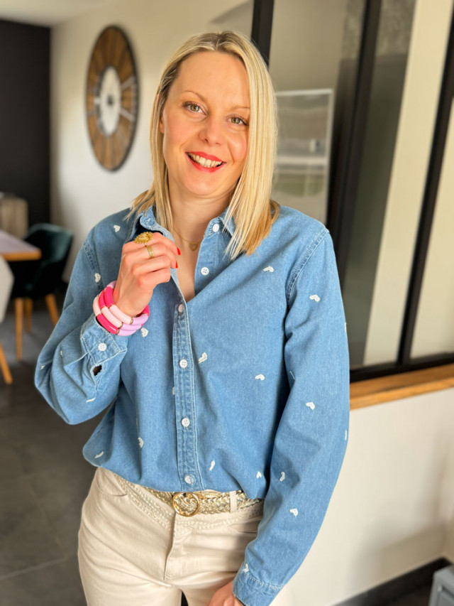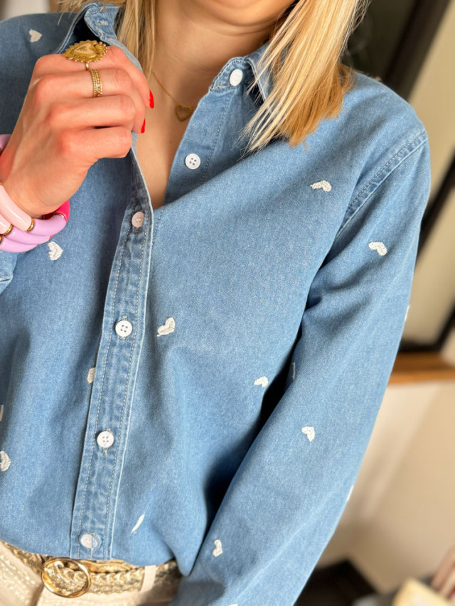 Redécouvrez l'incontournable chemise en jean dans une version ultra-romantique. Ce chemisier bleu style denim se pare de délicates broderies cœurs blancs, apportant une touche de douceur et de fantaisie à une coupe classique.