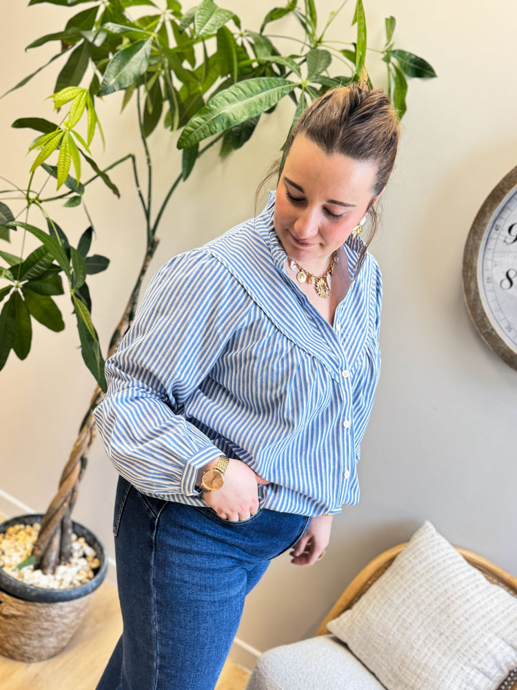 Le classique revisité avec légèreté. Indispensable de toute garde-robe, notre blouse rayée bleue apporte une touche de clarté et de sophistication à vos tenues quotidiennes.