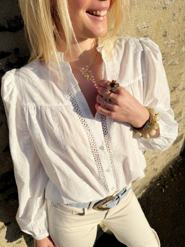 Apportez une touche de douceur et d'élégance à votre garde robe avec notre blouse blanche à broderie cœurs ton sur ton. Ses détails délicats en font la pièce idéale pour vos looks printaniers.