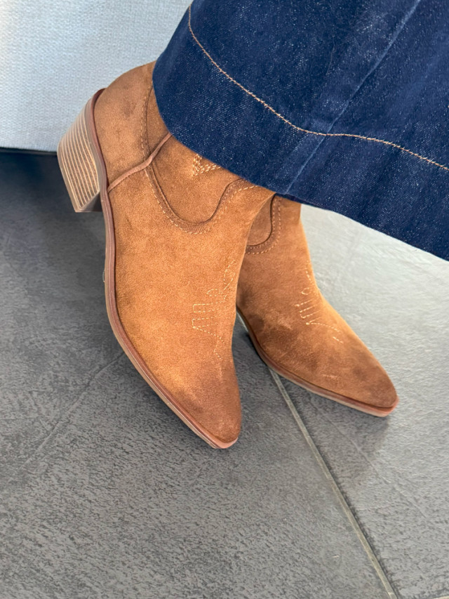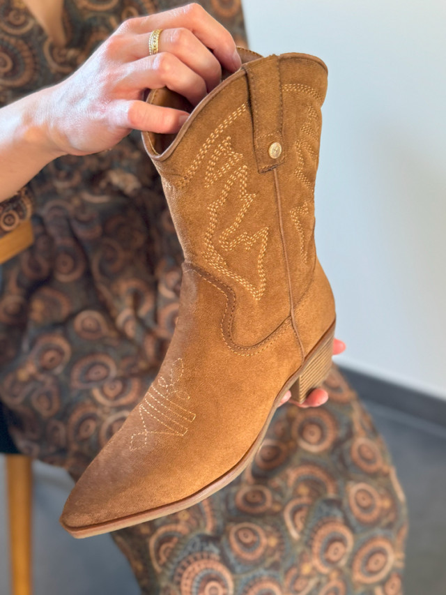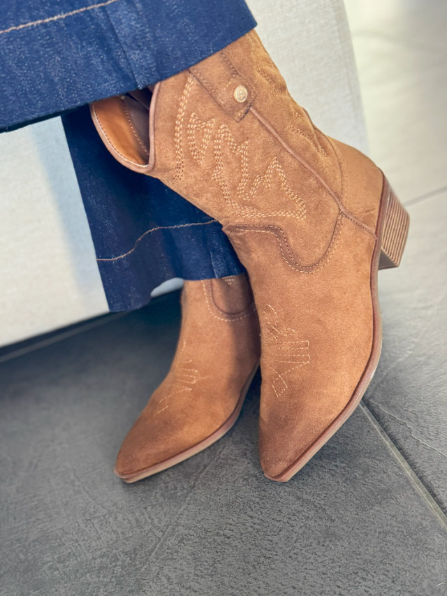 Apportez une touche de caractère à vos tenues avec ces bottines style santiag camel. Inspirées du look western, elles se distinguent par leurs surpiqûres travaillées et leur teinte chaude, idéale pour la saison.