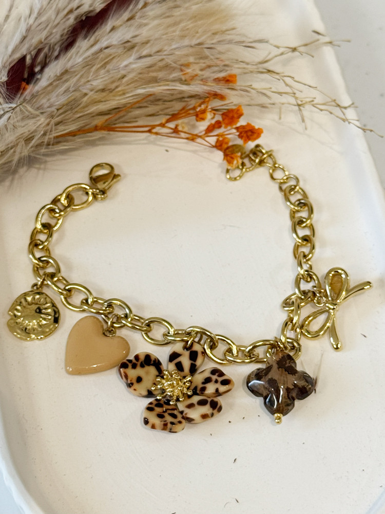 Craquez pour ce bracelet chaînette doré orné de divers pendentifs délicats, parfait pour apporter une touche de lumière et de finesse à votre poignet.