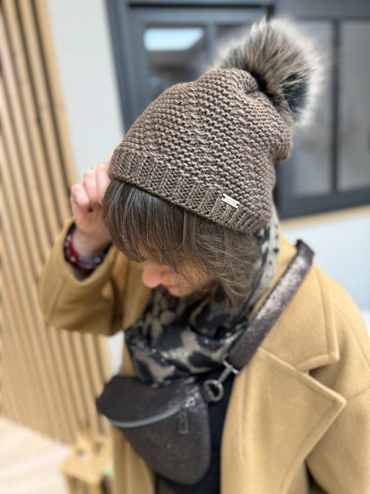 Restez au chaud avec ce bonnet marron à pompon, alliant confort et style.