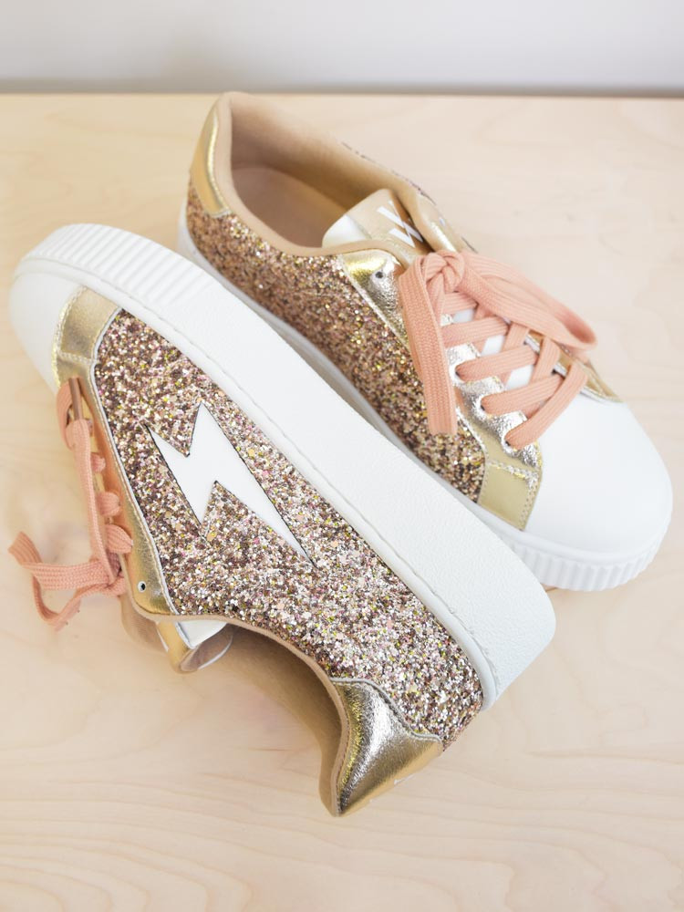 Craquez sur ces baskets Elise de la marque Vanessa Wu, à paillettes roses et or