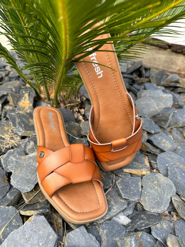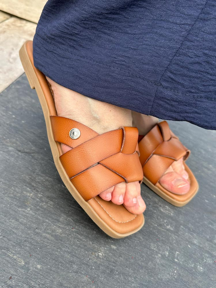 Sandales façon claquettes, taupe avec brides croisées sur le dessus