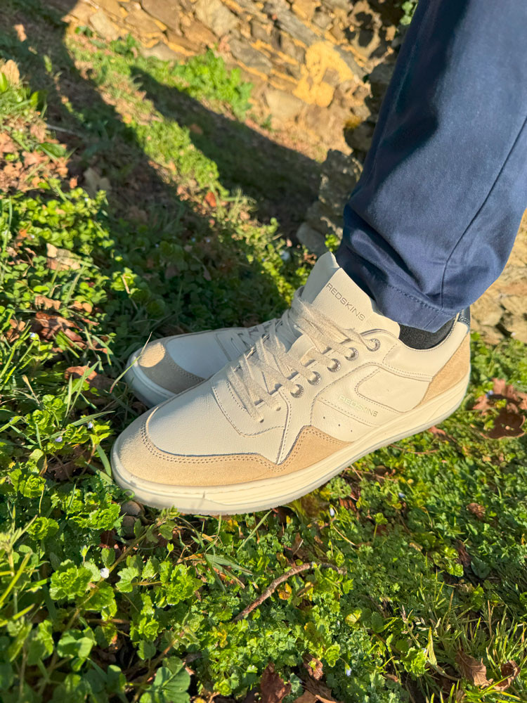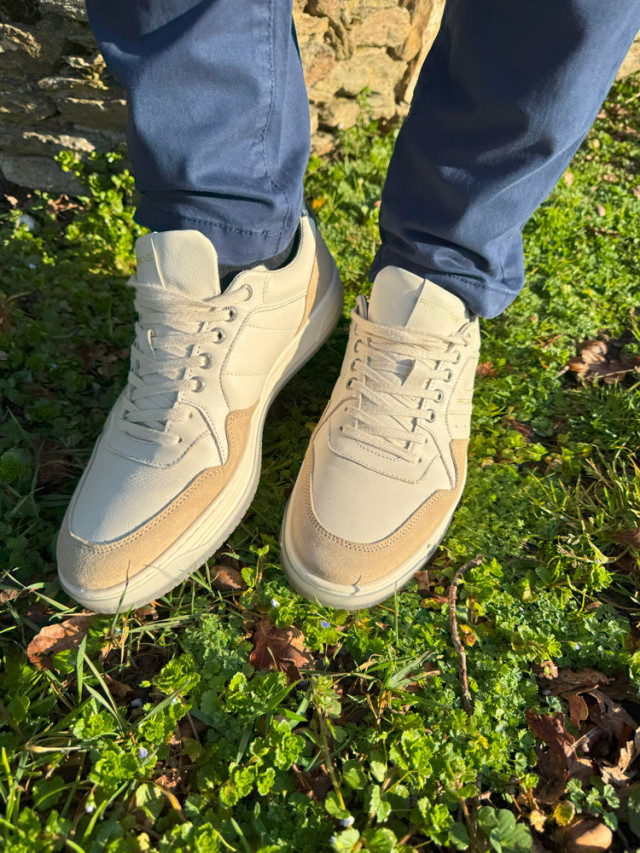 Affirmez votre style avec ces baskets beige et blanche au design épuré et au style urbain.
