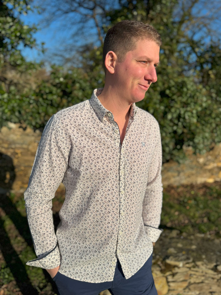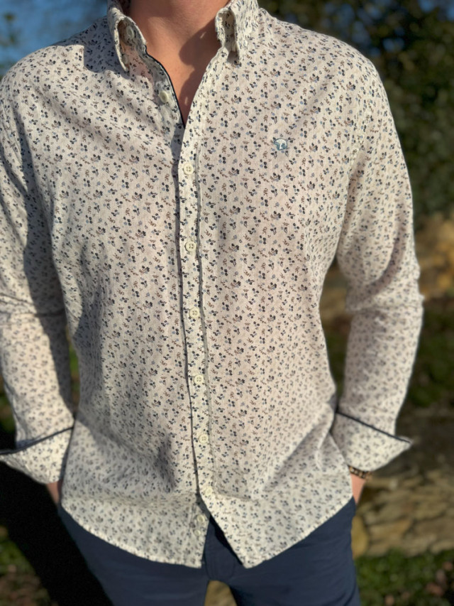 Ajoutez une touche sophistiquée printanière à votre tenue avec cette chemise en lin et ses délicates fleurs bleu et marine