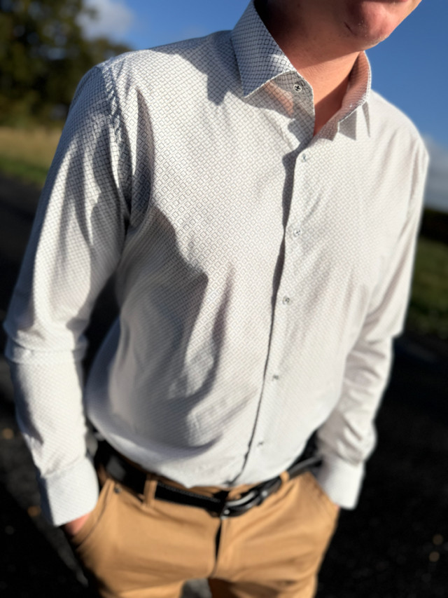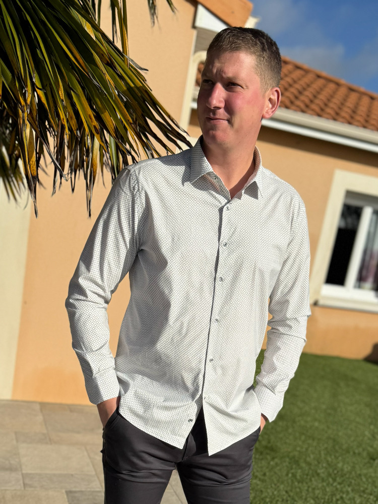 Alliez élégance et modernité avec cette chemise blanche aux motifs graphiques. Ses touches de marine et camel apportent un contraste subtil et raffiné, pour un style à la fois chic et contemporain.