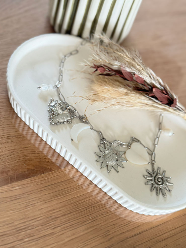 Laissez-vous séduire par le charme irrésistible de notre collier en argent et ses multiples pendentifs.