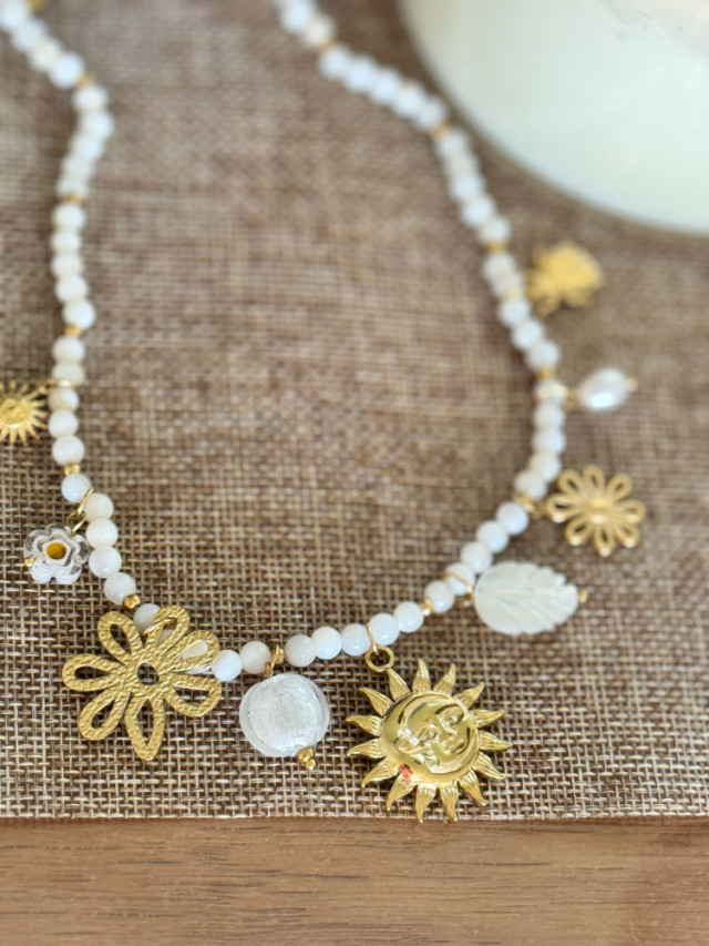 Alliez l'élégance intemporelle des perles blanches à la fantaisie moderne des breloques avec ce collier unique. Ce bijou raffiné est l'accessoire idéal pour apporter une touche de luminosité et de personnalité à votre décolleté.