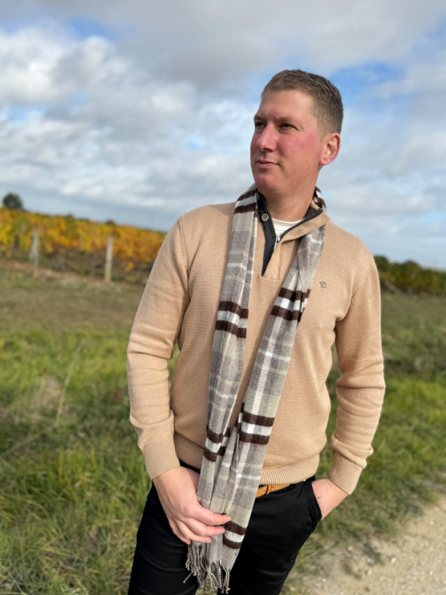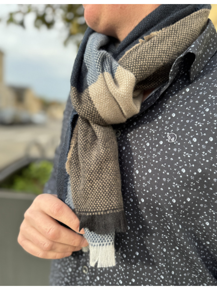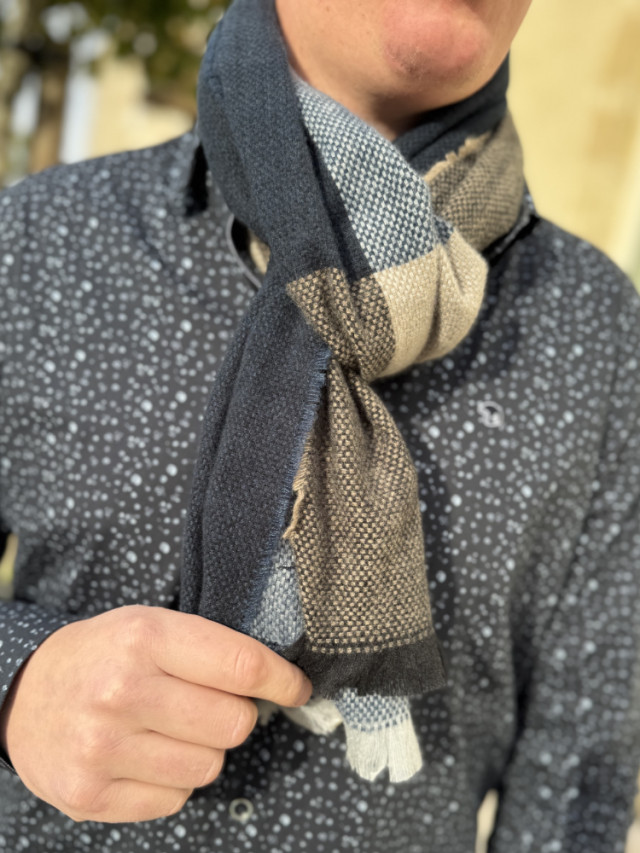 Apportez une touche d’élégance à votre tenue avec cette écharpe pour homme aux tons bleu et marron. Douce, chaude et raffinée, elle s’accorde facilement.