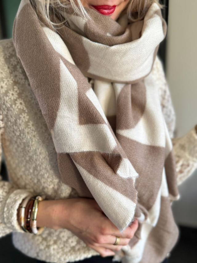 Adoptez une touche de douceur avec cette écharpe aux tons beige et taupe, des couleurs naturelles et harmonieuses qui subliment toutes les tenues.