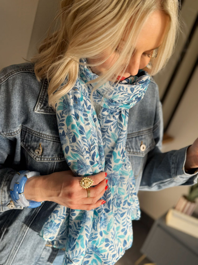 Apportez une touche de poésie à votre garde robe avec notre foulard bleu aux motifs fleuris.