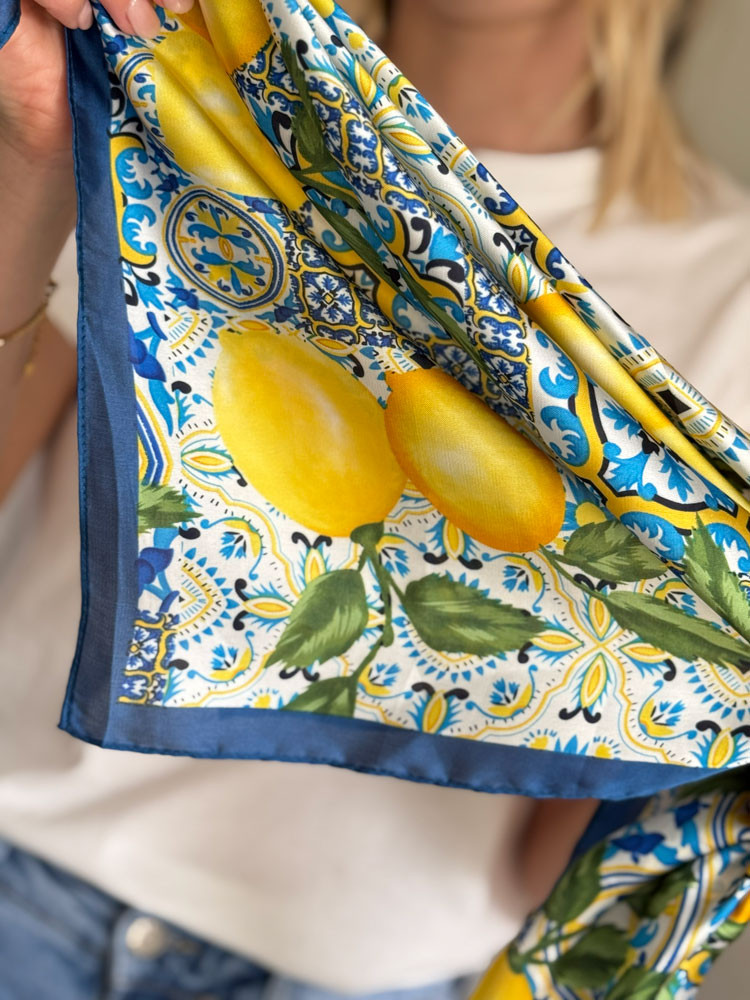 Illuminez votre garde-robe avec ce magnifique carré de soie bleu et jaune, orné d'un motif citrons vibrant. Cet accessoire de mode estival finira votre tenue par une note fraiche et sophistiqué.