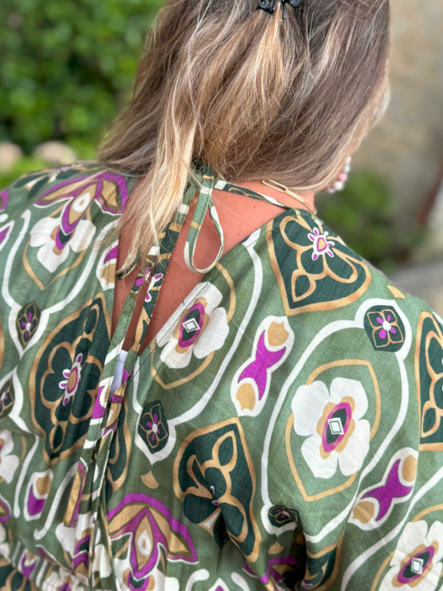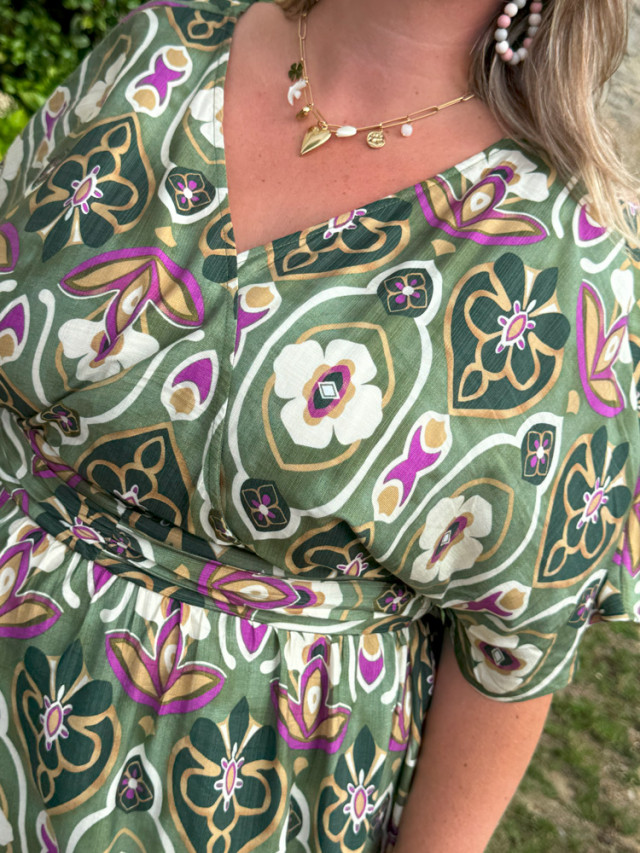 Osez la couleur et les imprimés avec cette jolie robe longue verte ornée de touche violine pour réveiller votre côté bohême.