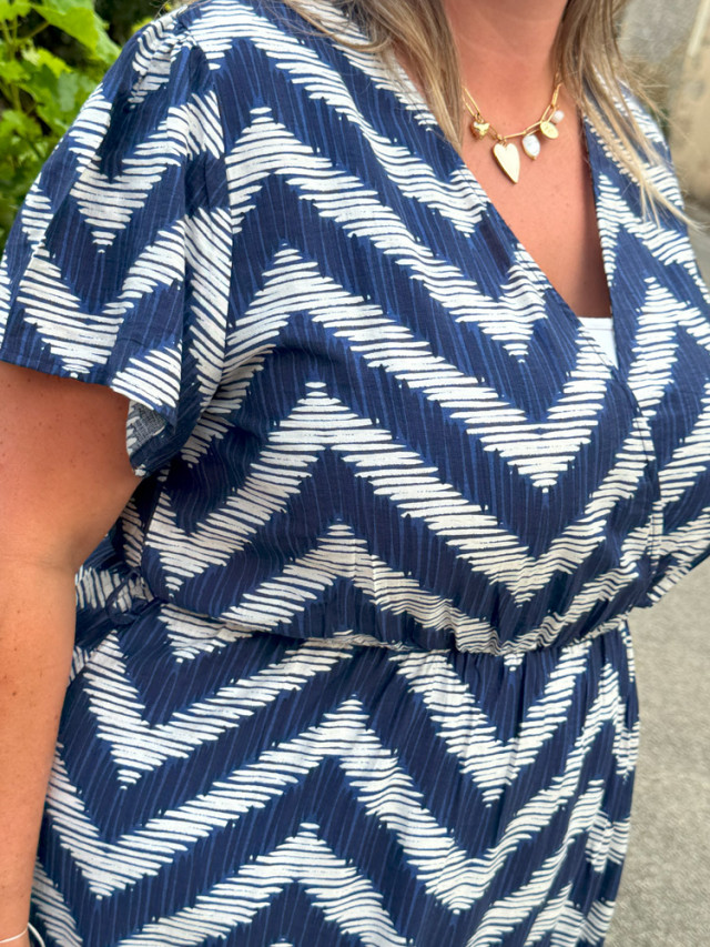 Optez pour une silhouette fluide et tendance avec cette robe longue bleu et son imprimé graphique en zigzag.
