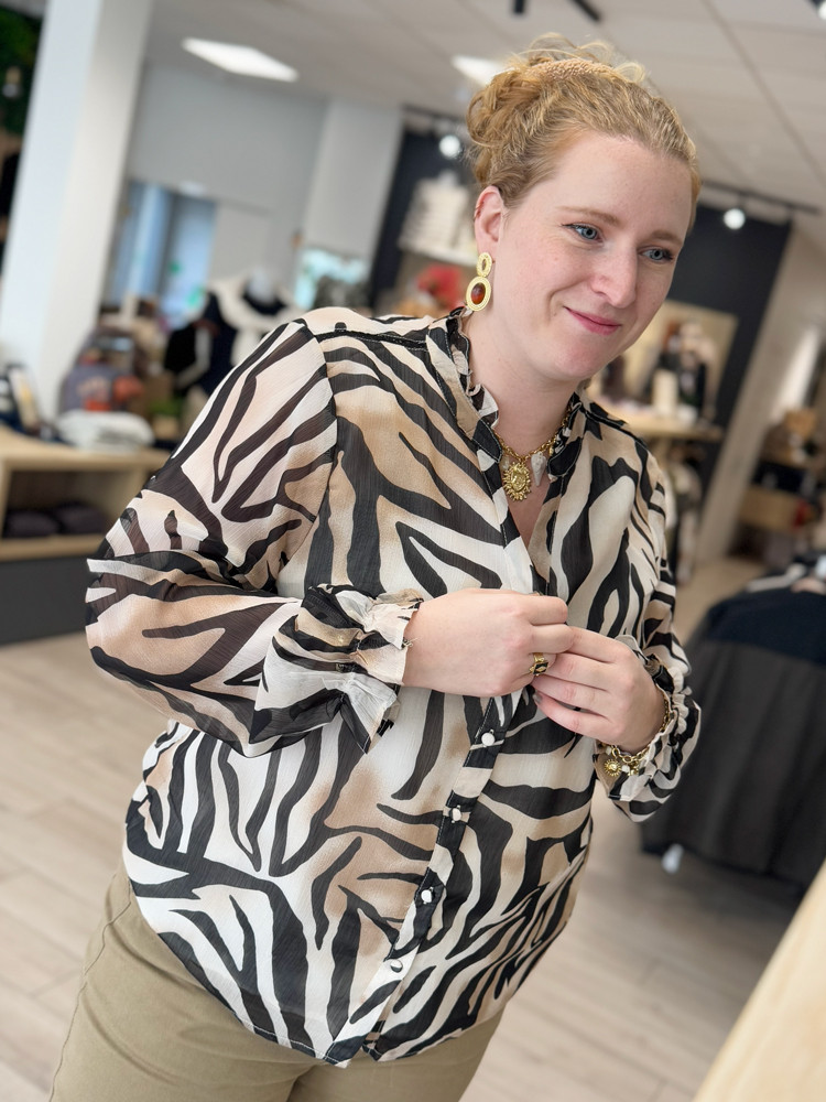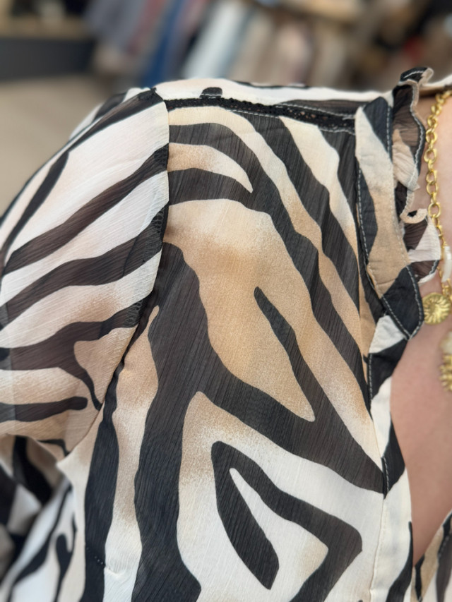 Affichez un style audacieux et élégant avec cette blouse aux motifs zébrés. Les contrastes noir et beige apportent une allure moderne et graphique.