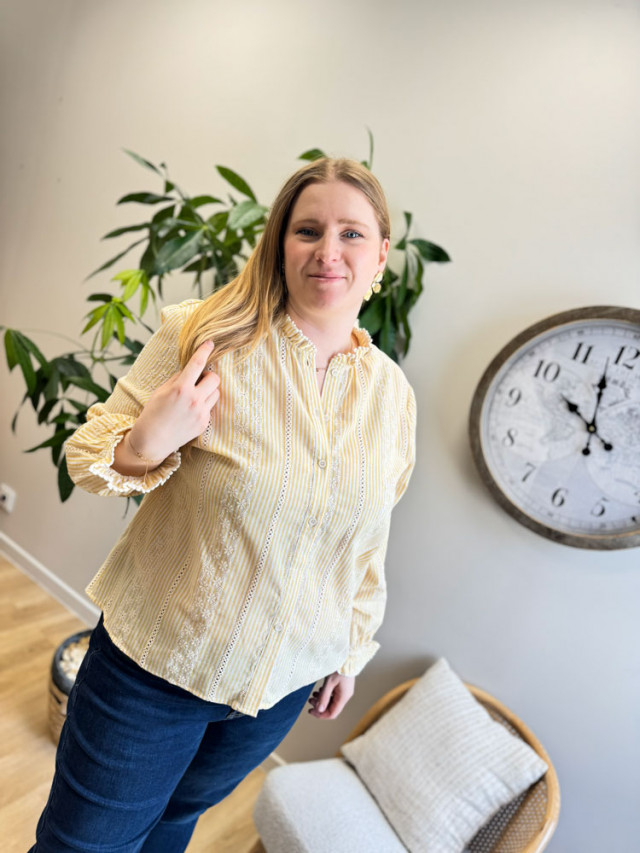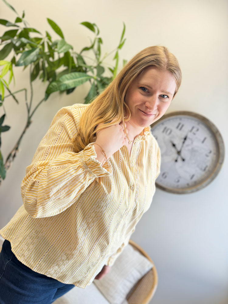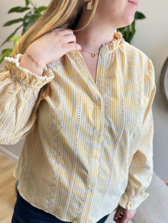 Apportez du soleil à votre garde-robe ! Craquez pour cette magnifique blouse aux rayures verticales jaunes et blanches, l'alliée parfaite pour un look frais et lumineux. Intemporelle et charmeuse par sa dentelle, cette pièce sera votre indispensable pour la mi-saison.