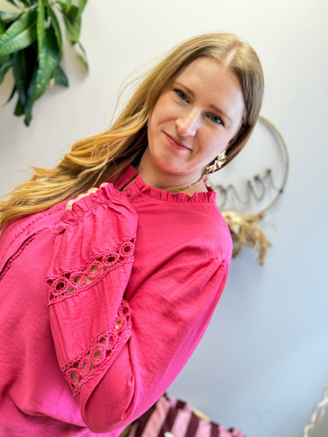 Apportez une dose de féminité à votre garde-robe avec notre nouvelle blouse Luisa. Pièce maîtresse de la saison, elle se distingue par ses délicats en broderie anglaise ajourée qui jouent sur la transparence avec élégance.