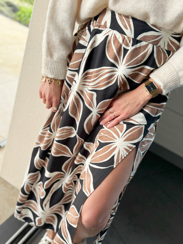 Apportez élégance et féminité à vos tenues avec cette jupe longue noire ornée de motifs floraux beiges. Sa coupe fluide et légère offre un confort optimal.