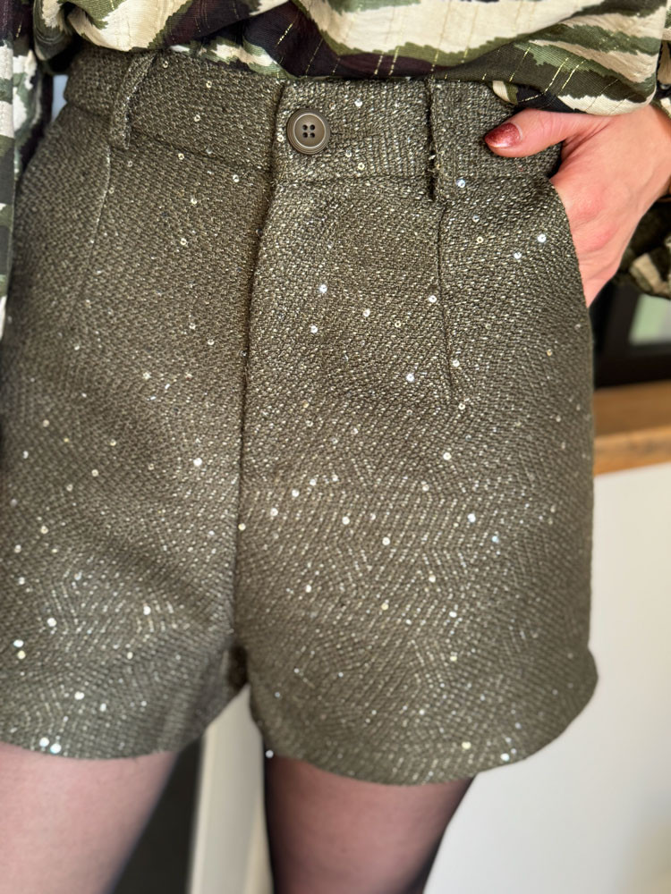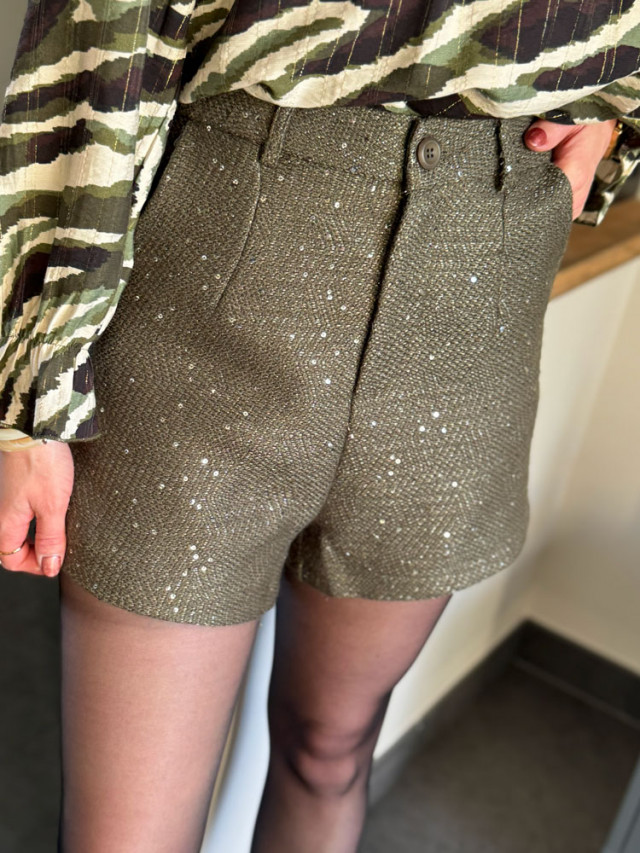 Ajoutez une touche de glamour et de modernité à votre tenue avec ce short kaki à sequins brillants.