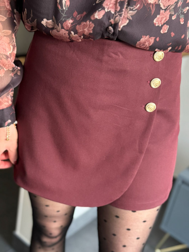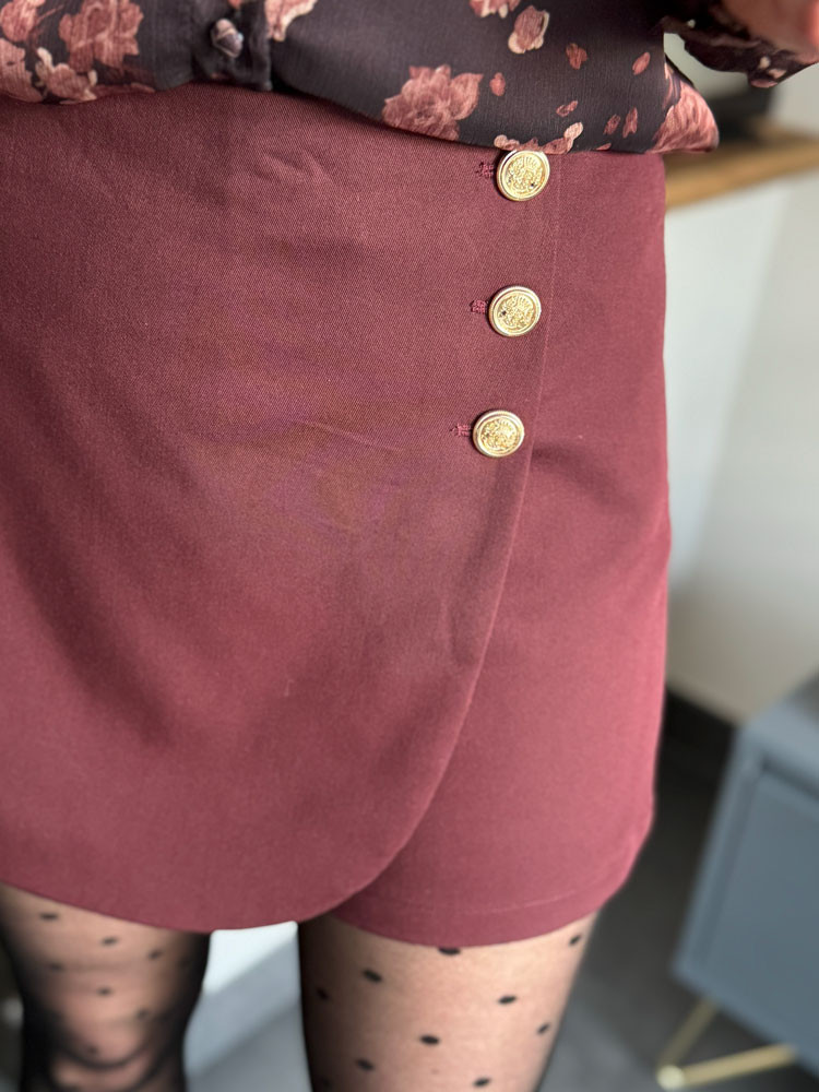 Alliez élégance et originalité avec cette jupe short bordeaux à boutons officiers, chic et tendance.