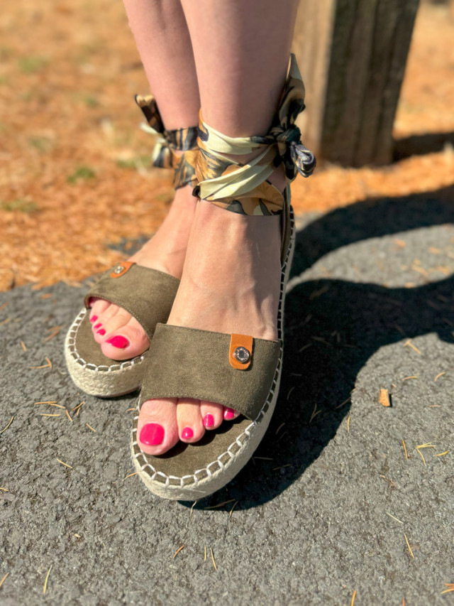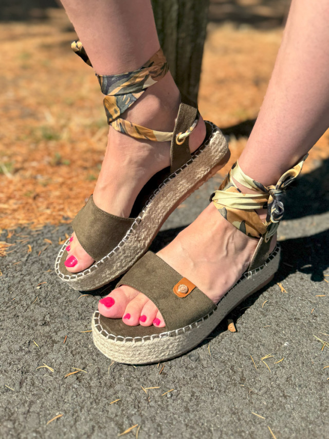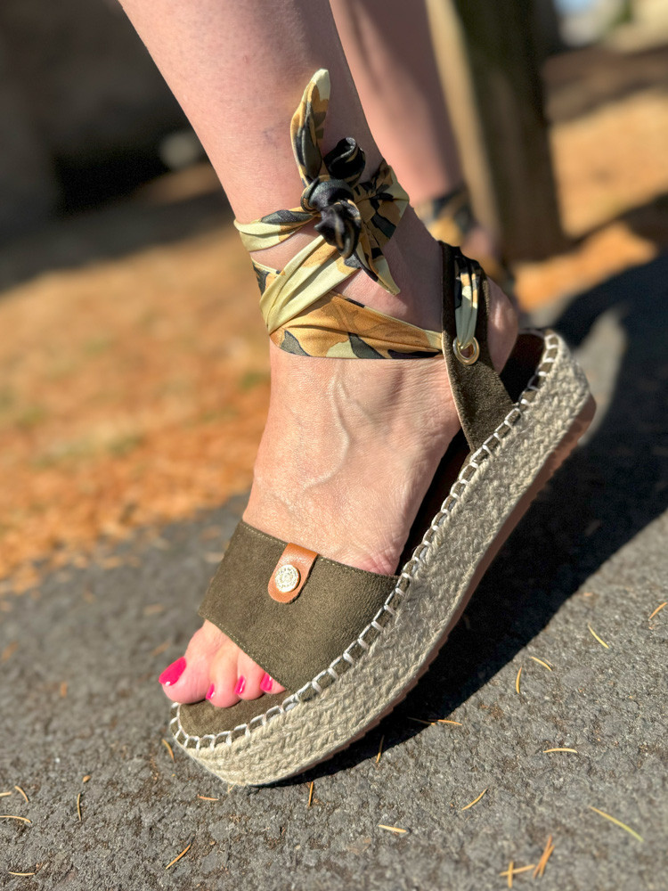 Apportez une touche bohème chic à vos tenues avec ces sandales compensées kaki estivale. Son ruban imprimé à nouer autour de la cheville réhaussera votre look avec subtilité