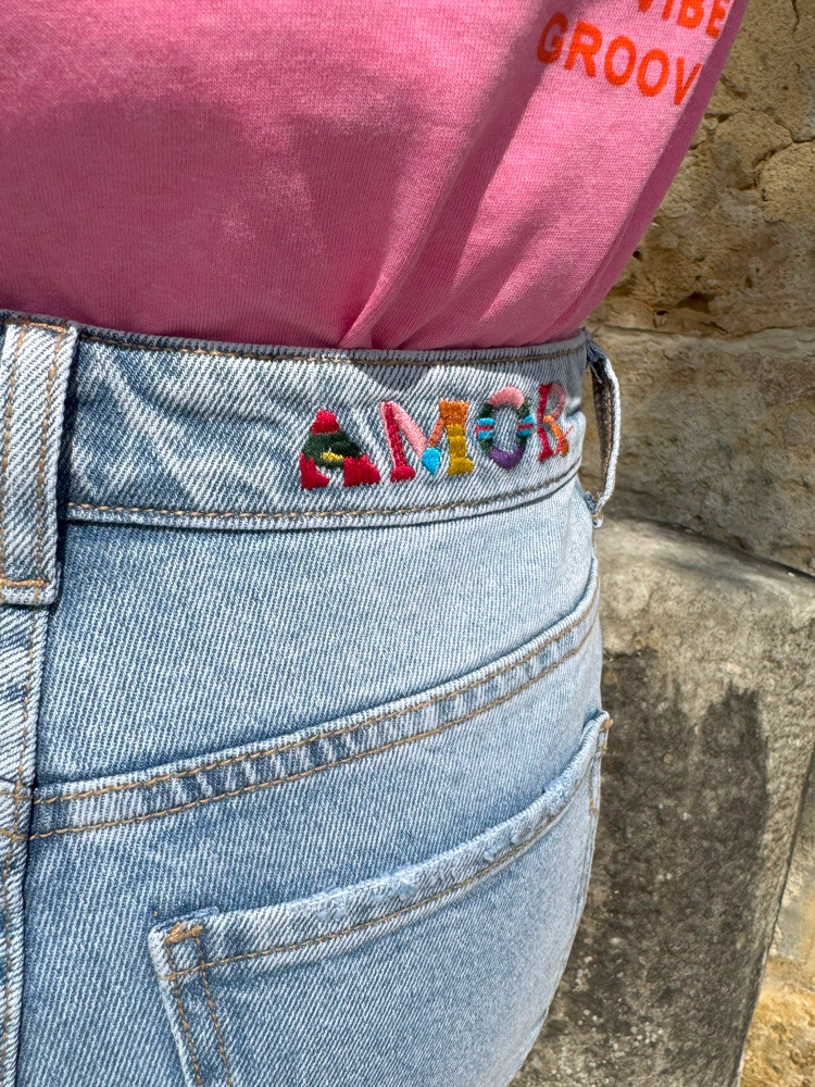Affirmez votre look avec ce jean large et sa touche originale Amour brodé en couleur au dos.