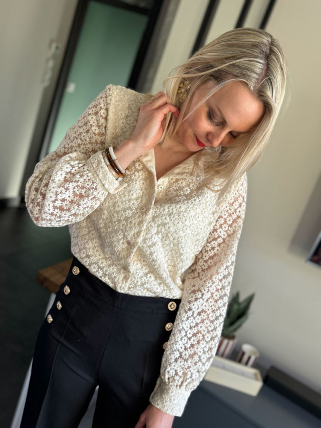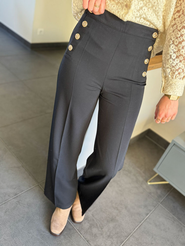 Optez pour un style professionnel et raffiné avec ce pantalon tailleur noir à boutons dorés fantaisies sur les côtés. Sa coupe ajustée et structurée met en valeur la silhouette tout en offrant confort et élégance.