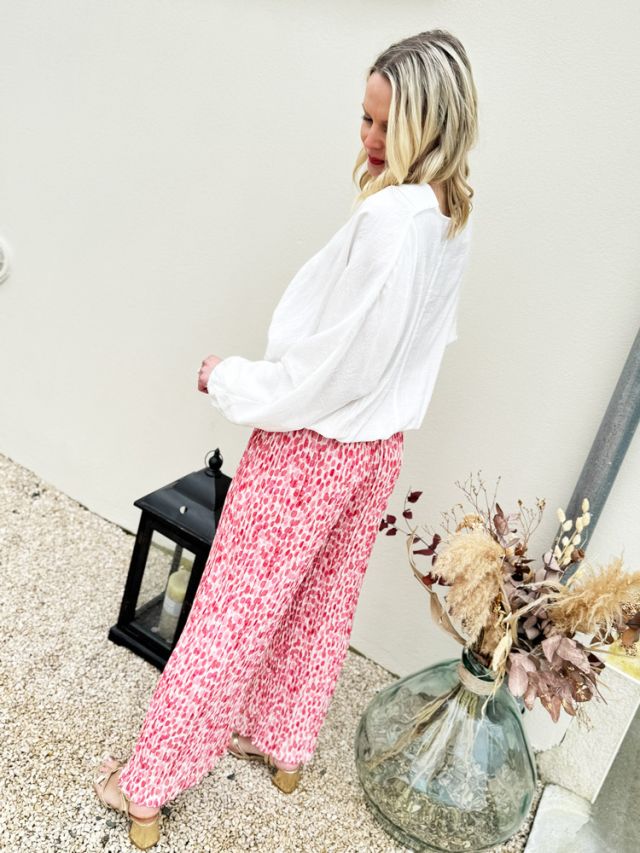 Craquez pour ce pantalon fluide large à poids rose et son tissu plissé léger et aérien. Une pièce tendance, agréable à porter parfaite pour vos tenues estivales.