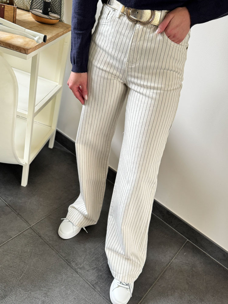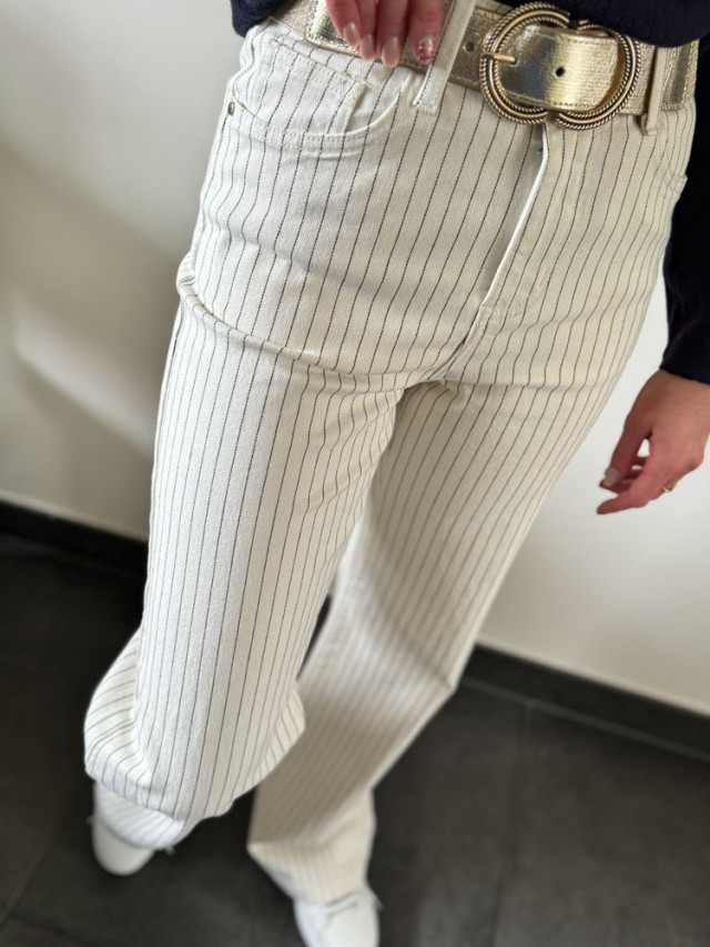 Adoptez une allure tendance et décontractée avec ce jean large beige rayé noire. Sa coupe ample offre une silhouette moderne et confortable.