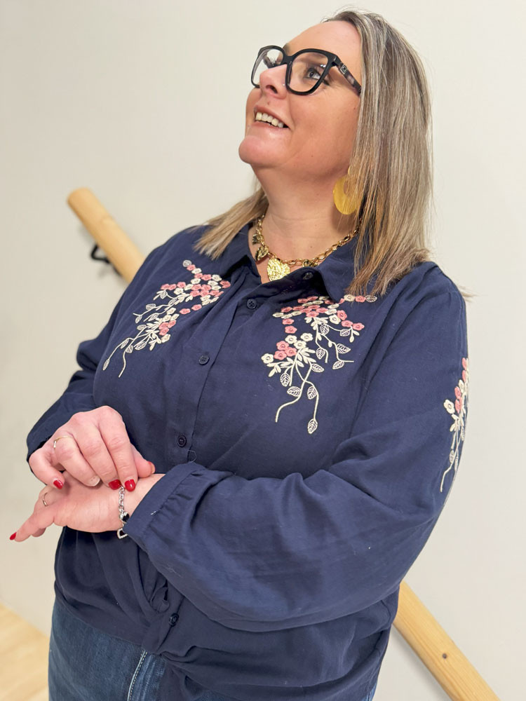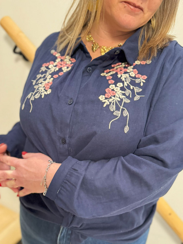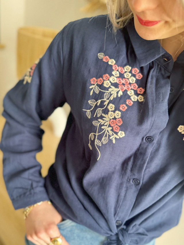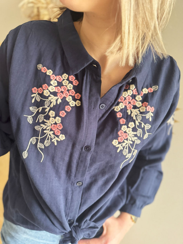 Ajoutez une touche de romantisme à votre tenue avec cette chemise marine et sa délicate broderie floral aux couleurs douces de printemps