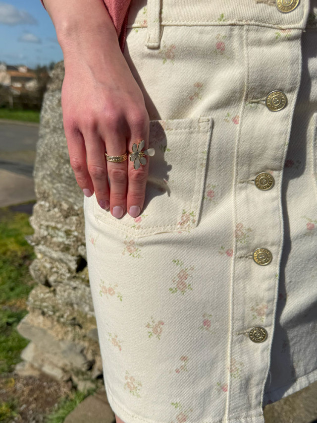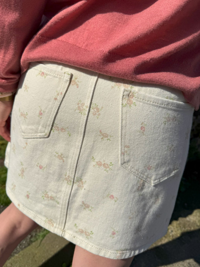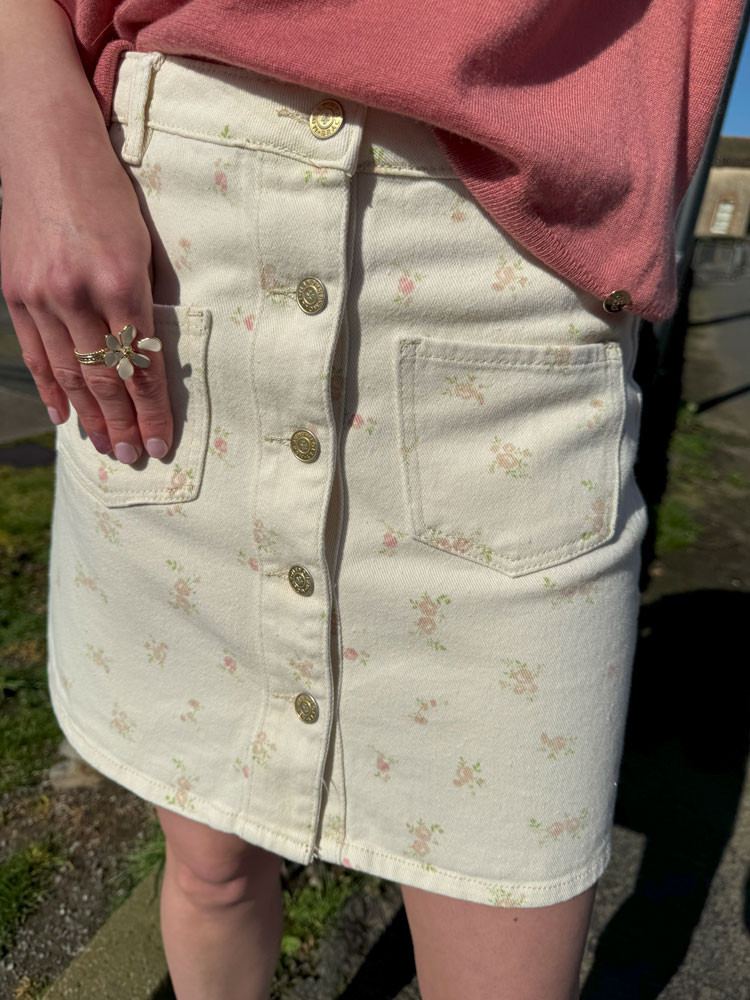 Ajoutez une touche de printemps à votre dressing avec cette jupe en jeans beige et ses délicates petites fleurs aux douces couleurs printanières