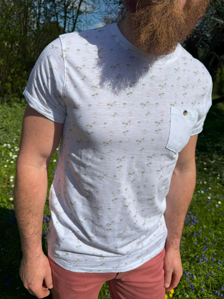 Partez en voyage avec ce t-shirt blanc et ses motifs palmiers pour un look d'été tendance