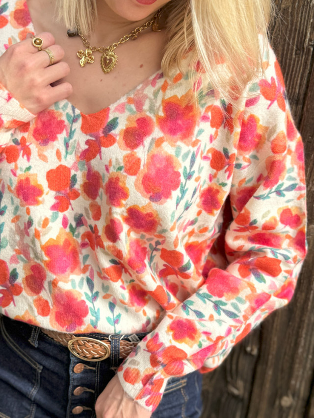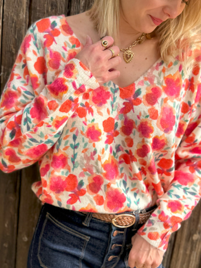 Ajoutez une touche de fraîcheur et de douceur à votre garde robe avec ce taille à taille unique et ses petites fleurs roses orangées