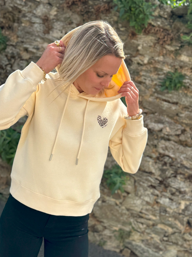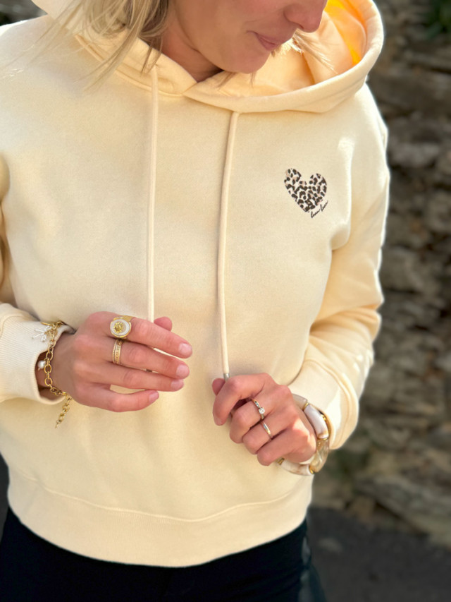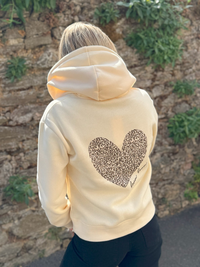 Affichez un style décontracté avec ce sweat beige à capuche et son petit cœur léopard qui vous fera craquer.
