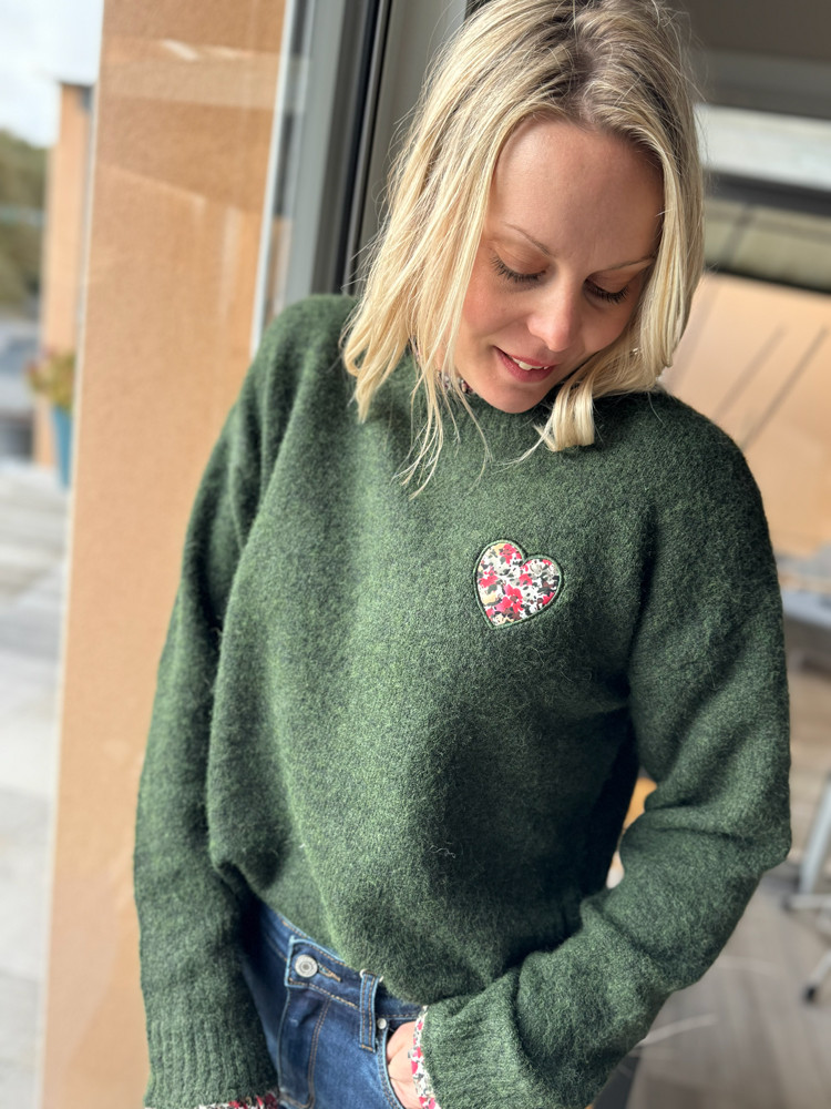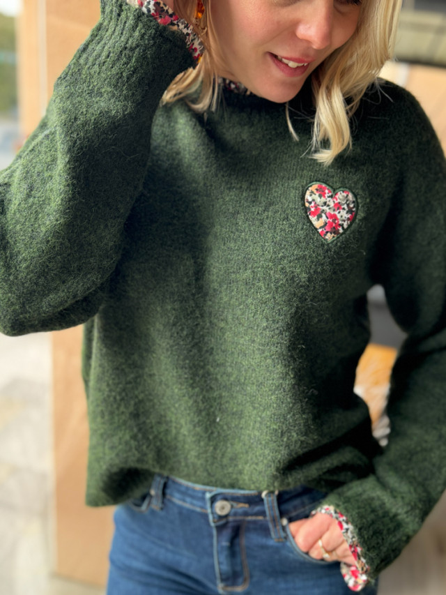Alliant douceur et originalité, ce pull se distingue par son motif cœur en tissu Liberty et son liseré assorti.