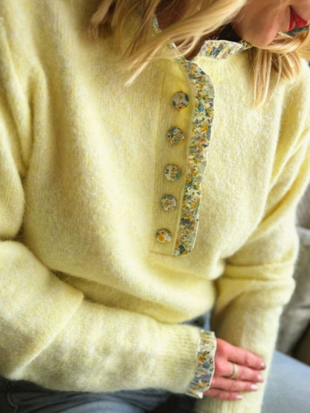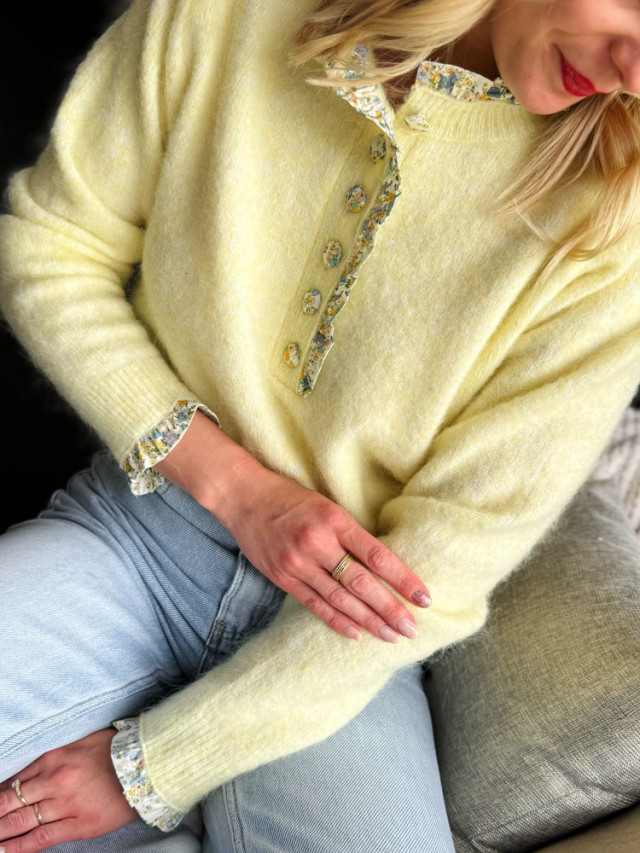 Réveillez votre vestiaire de saison avec notre pull jaune à la teinte vibrante et chaleureuse. Ce modèle se distingue par ses finitions raffinées un Liberty qui vient border délicatement le col et les boutons