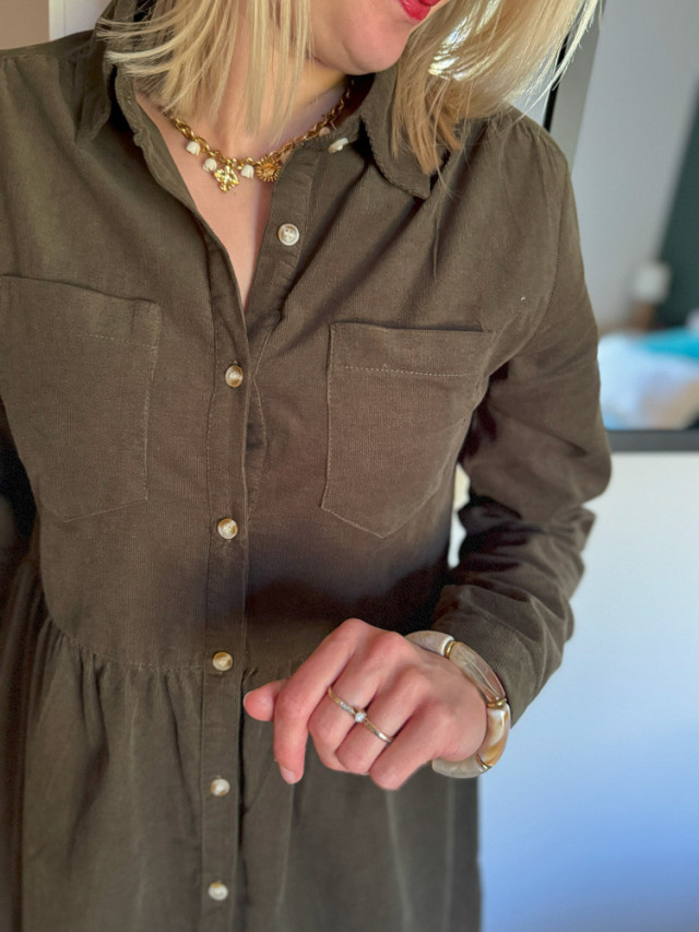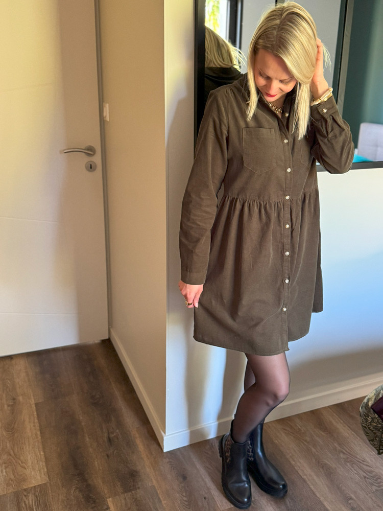 Alliez élégance et confort avec cette robe courte en velours kaki.