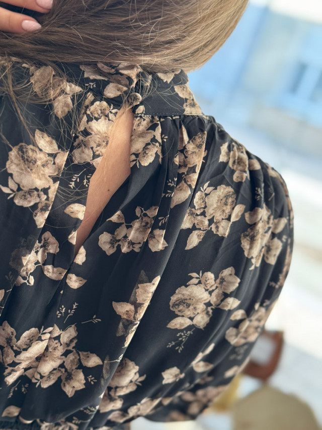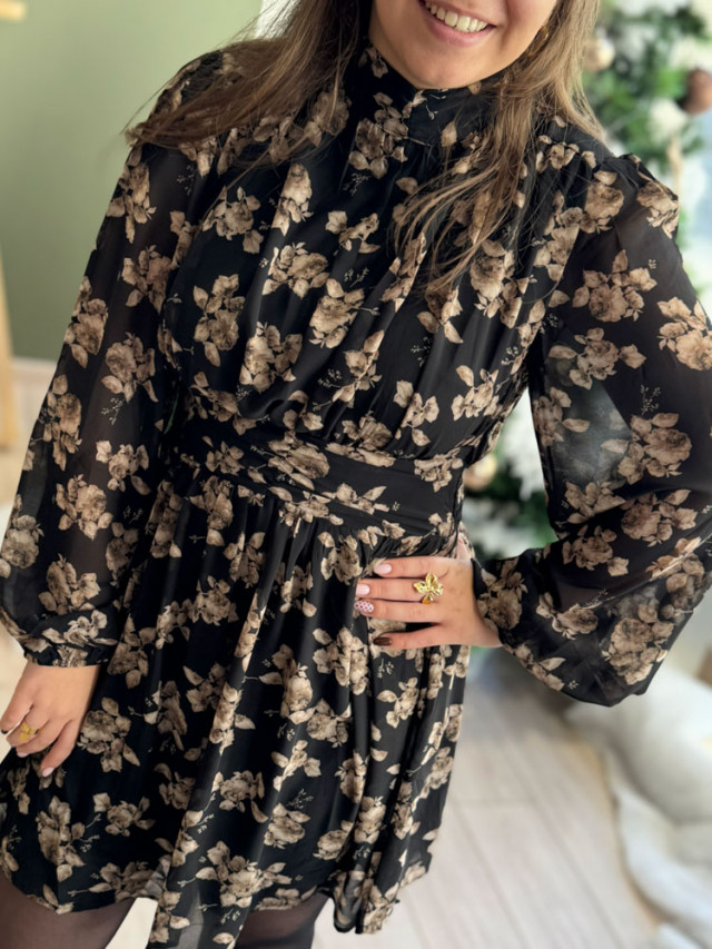Craquez pour cette robe courte noire sublimée par de délicates fleurs taupe, qui apportent une touche de douceur et d’élégance à votre tenue. Son col montant met en valeur le port de tête et apporte une note chic