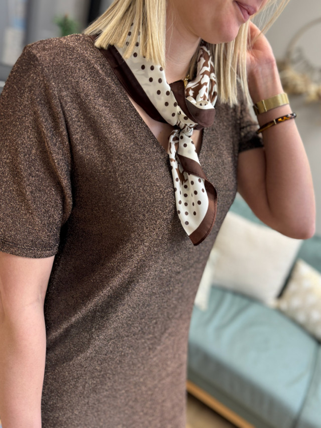 Brillez en toutes occasions avec cette robe bronze ornée de paillettes scintillantes. Coupe droite et flatteuse, elle sera agréable à porter
