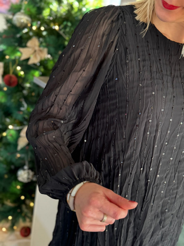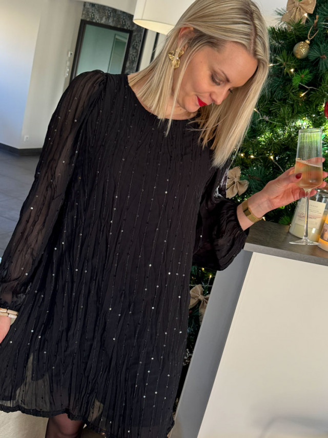 Brillez lors de vos soirées avec cette robe droite noire à sequins, chic et féminine, ornée d’un nœud raffiné dans le dos.